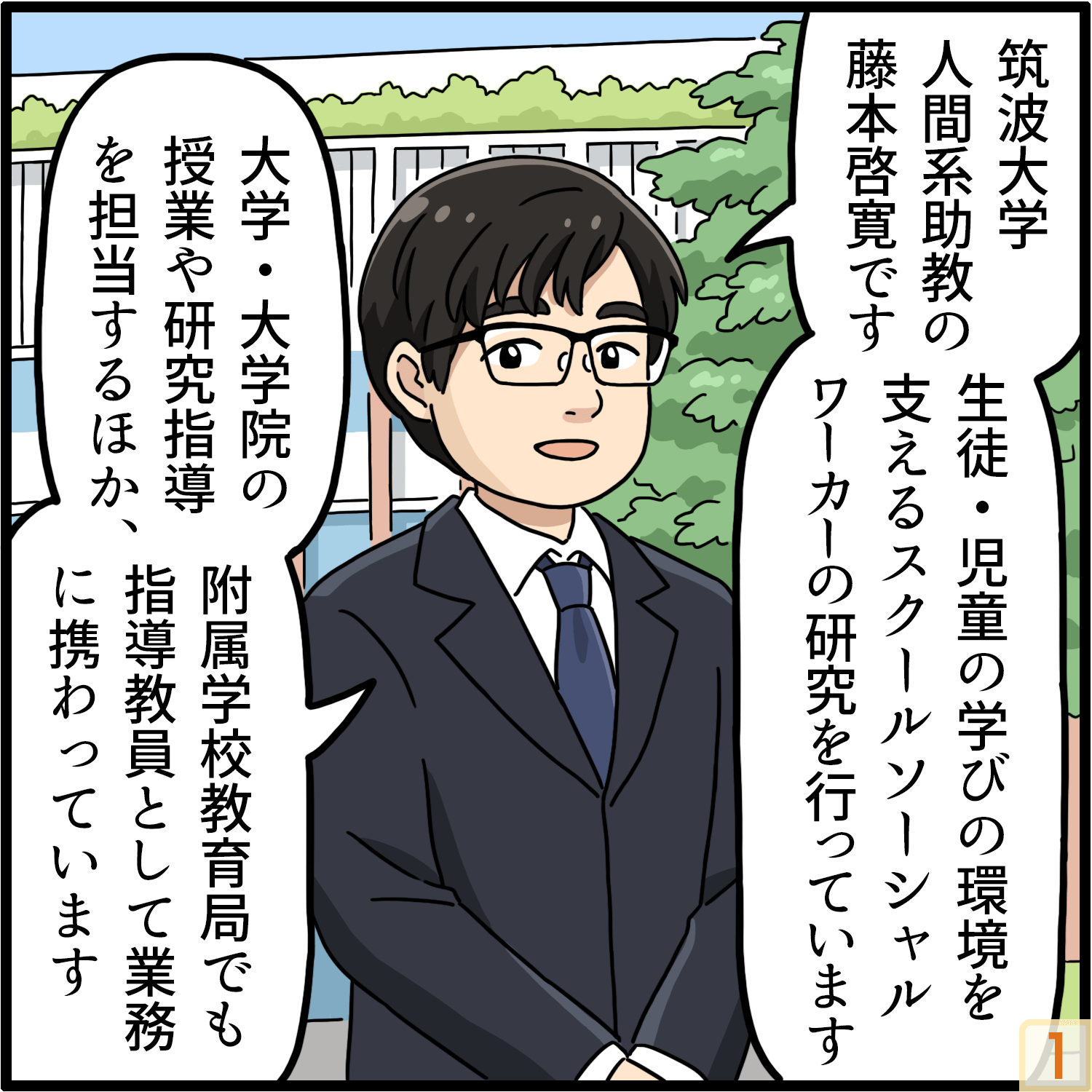 児童・生徒の学びの環境を支える、スクールソーシャルワーカーについて研究しています。具体的には、スクールソーシャルワーカーとして働く人々がやりたいと思った通りに、すなわち自律性を持って仕事をすることができているのかということに注目しています。また、筑波大学附属学校教育局で指導教員も務めており、主にスクールカウンセラーとスクールソーシャルワーカーの統括業務を行っています。また、筑波大学の障害科学類や社会人大学院での授業、研究指導も担当しています。