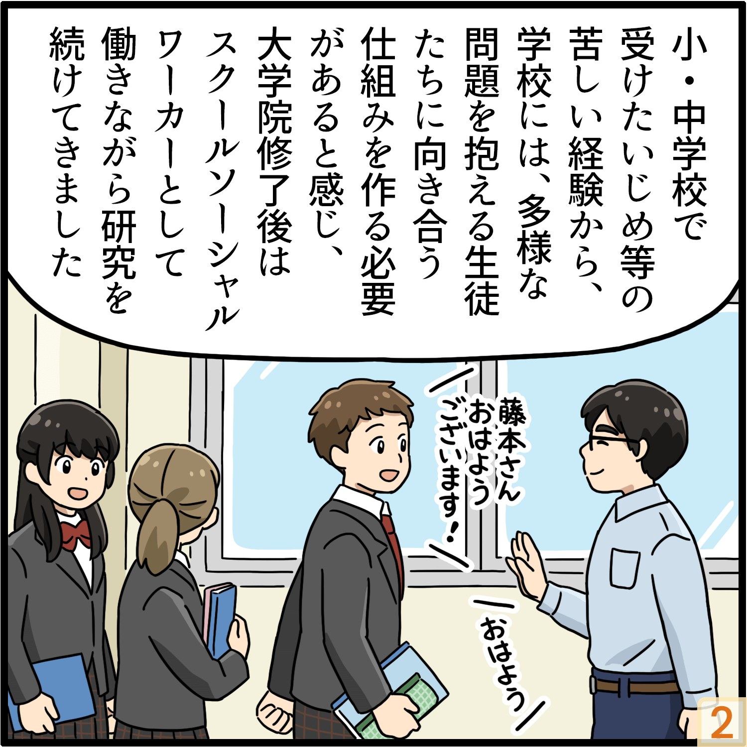 小・中学校でいじめを受けたことが最初のきっかけです。担任の先生らが話し合いの場を設け、指導してくださったことでいじめは収まったのですが、苦しんだ経験から「学校を傷つく人が出ない場にしたい」と思うようになり、学校生活での悩みについて休み時間や放課後に友人と一緒に考えるようになりました。高校入学後は、受験実績ばかりに目を向ける学校に違和感を覚え、むしろさまざまな問題を抱える目の前の生徒に向き合うべきなのではないかと思いつつも、受験勉強に追われる日々を過ごしていました。そのような自己矛盾を感じながら、将来は教育に携わりたいと思い早稲田大学教育学部に進学しました。在学中にスクールソーシャルワーカーの存在を知り、自分もなりたいと思いどのような職業なのか学び始めたところ、学校の先生との連携の難しさなどの課題があることも知りました。そこで、スクールソーシャルワーカーが自律性を持って働くにはどうしたらいいのかということを探る研究もしたいと思うようになりました。