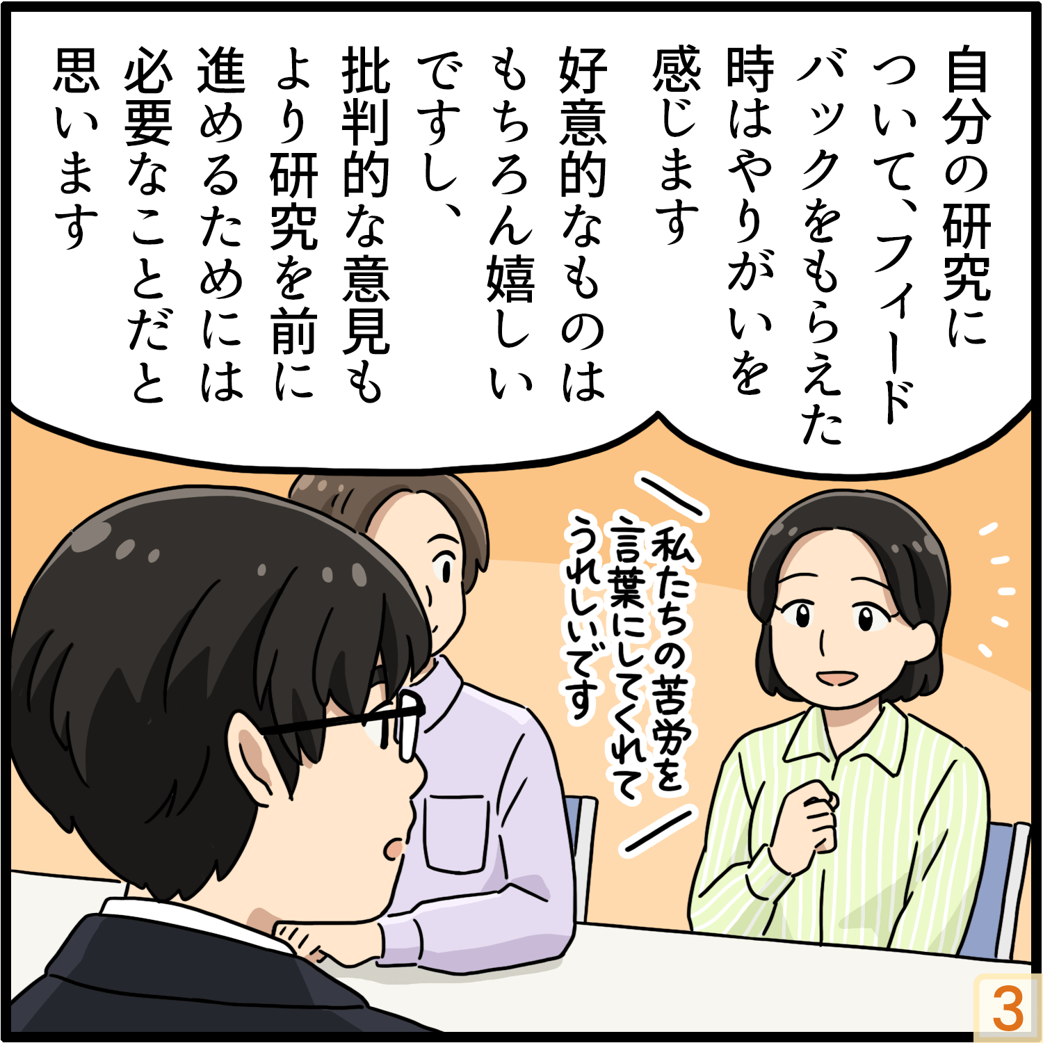 自分の研究についてフィードバックをいただいたときにやりがいを感じます。研究対象者の方々へ研究成果を伝える場を設けることがあり、スクールソーシャルワーカーの方々から直接フィードバックをいただくことが多いです。「苦労を言語化してくれて元気になった」などの好意的なフィードバックをいただくとやってよかったという気持ちになります。中には批判的なフィードバックもありますが、それを基に研究を前に進めていくことができるので、よいことだと思っています。