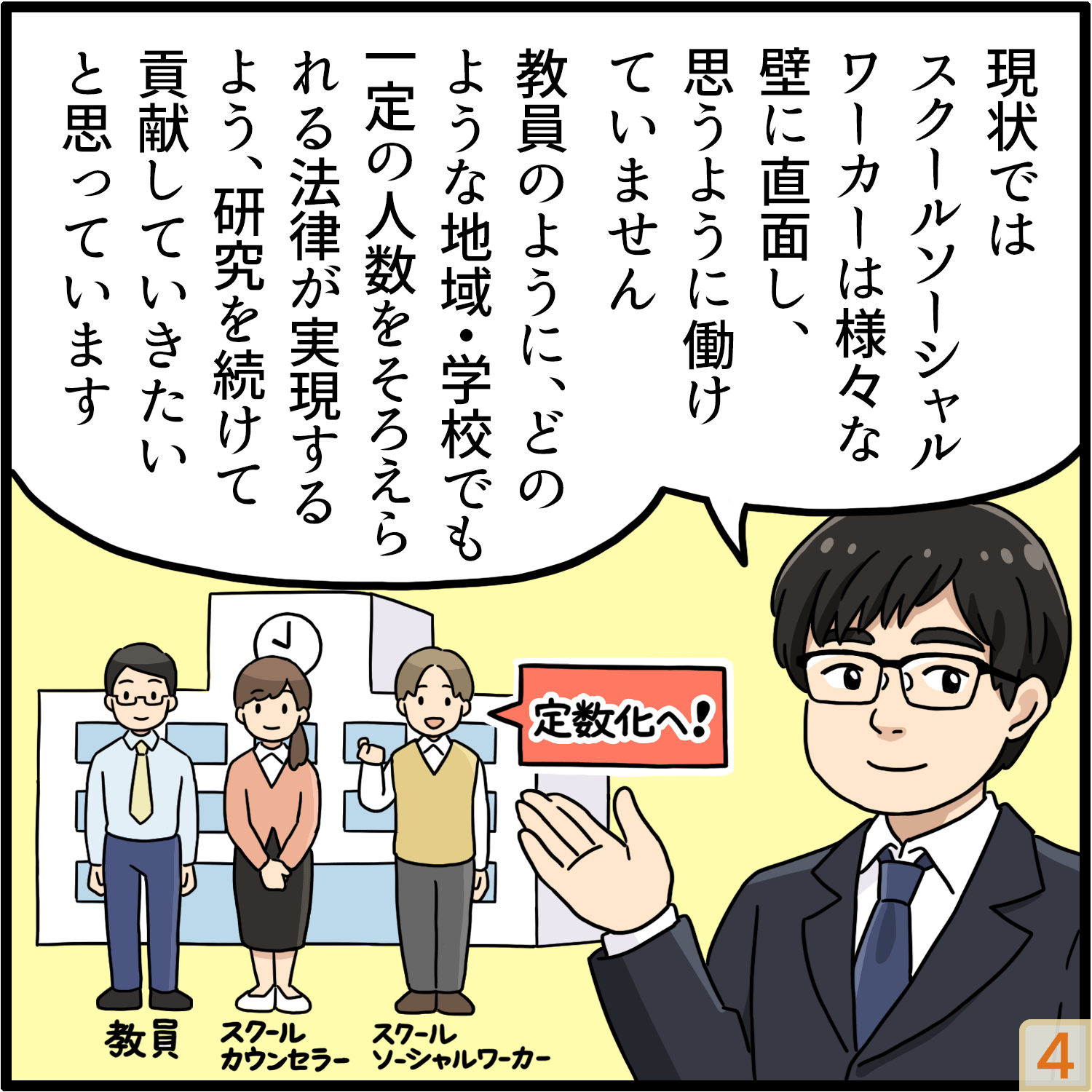 「義務標準法におけるスクールソーシャルワーカーの教職員定数化」の実現に貢献したいと考えています。義務標準法では、1学級の児童生徒数が35〜40人と定められ、学級数に応じて教職員定数が定められていますが、スクールソーシャルワーカーについてはそのような決まりがありません。そのため多くの学校・児童生徒を少人数で見なければならない状況になり、思うように動けないスクールソーシャルワーカーがたくさんいます。自治体の予算などによってバラバラの配置人数を引き上げてそろえる法律がスクールソーシャルワーカーにも必要だと考えています。その実現を目指して、研究を続けていきたいです。