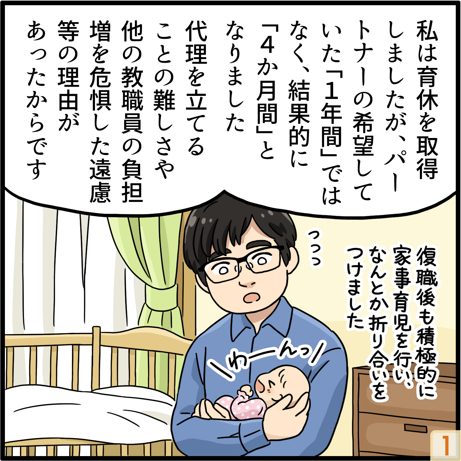 取得しないという選択肢は考えておらず、一番大変な時期である生後すぐから育休を申請しようと考えていました。期間について、パートナーは1年間を希望していましたが、実際に取得したのは約4か月間でした。パートナーの気持ちは百も承知でしたが、担当授業や研究指導の代理を立てることの難しさや、着任1年目であり、人数が少ない組織で他の教職員の負担増を危惧した遠慮が生まれたことから、1年間の申請をすることができなかったのです。育休期間が理想より短くなってしまった分、復職後も積極的に家事・育児を引き受けることでパートナーとの間でなんとか折り合いをつけました。