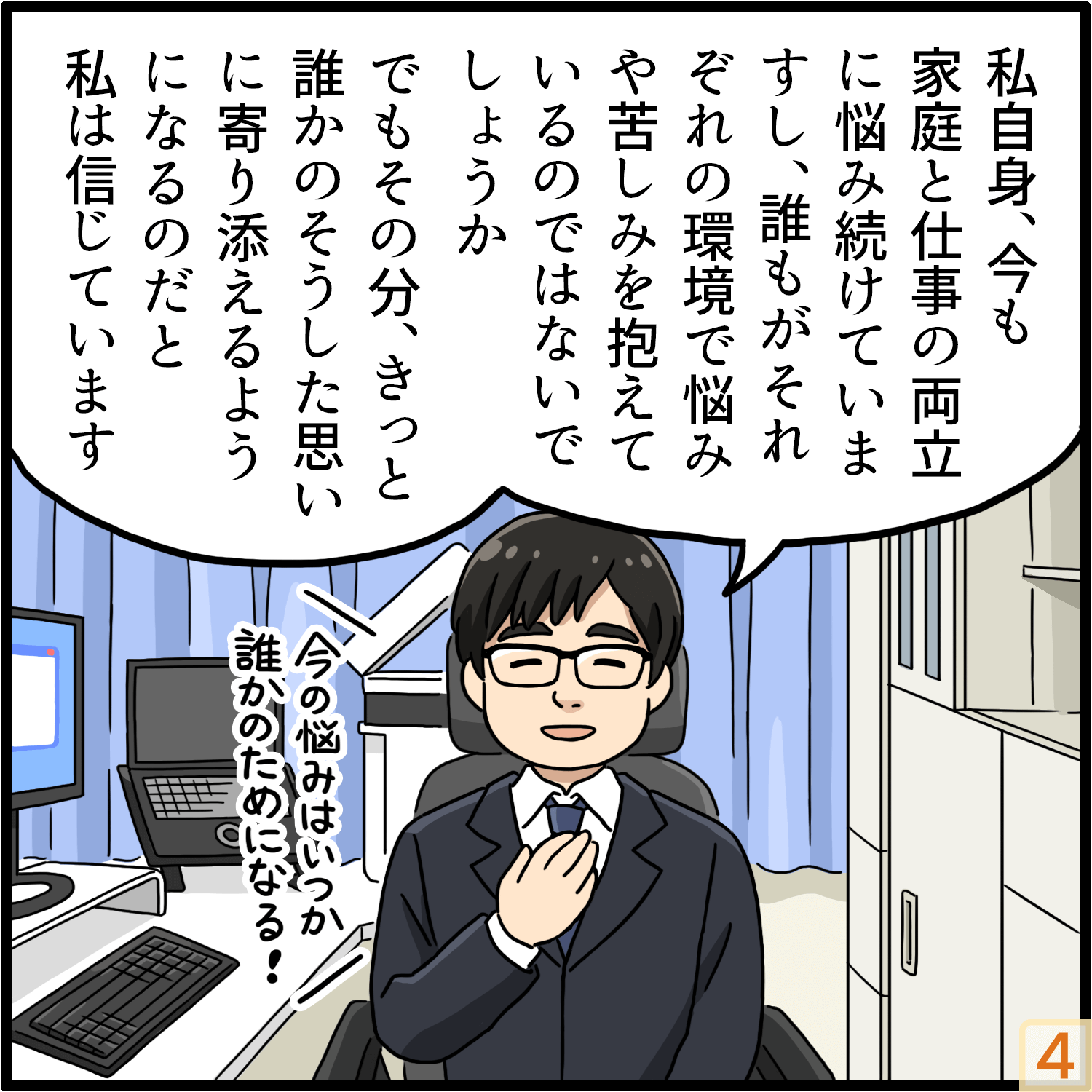 私自身も若い世代の研究者であり、家庭と仕事の両立に悩んでいる最中です。誰もがそれぞれ置かれた環境で悲しんだり苦しんだりすることがあると思いますが、その悲しみや苦しみはいつか誰かを支えたり、人の悲しみや苦しみに向き合っていく研究の糧となると信じています。
