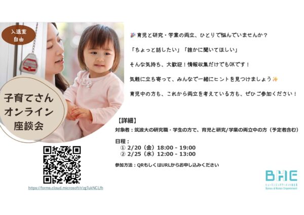 TOP > イベント > (2月開催)育児と研究の両立に関するオンライン交流会 > 育児オンライン交流会(BHE)