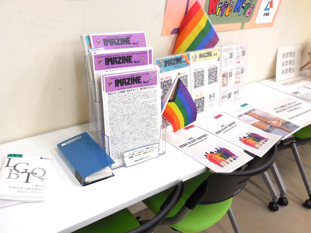 BHEの活動紹介ポスターや、教職員・学生スタッフから募った学術書籍、セーファースペースKiteKiteで普段利用されている書籍の紹介展示を行いました。